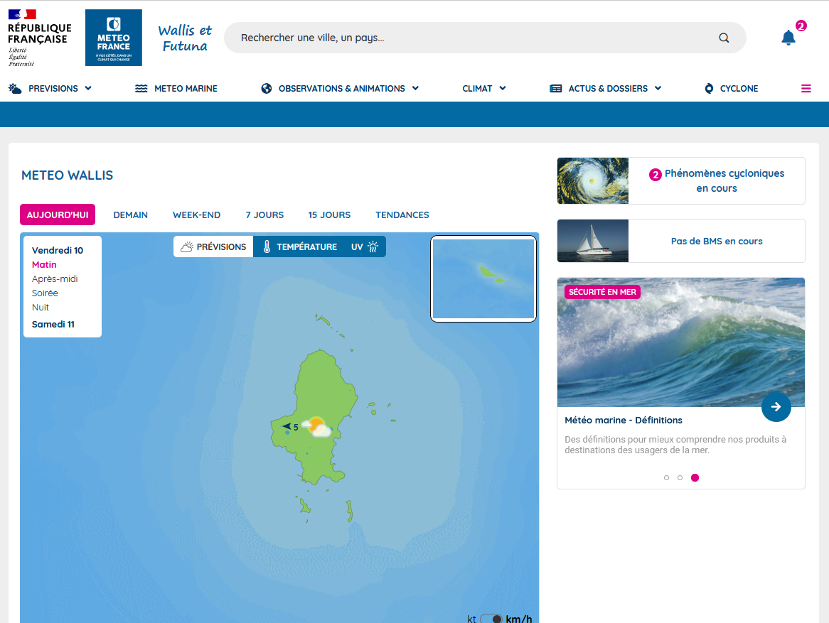 15/04/2026Les îles de Wallis-et-Futuna ont désormais leur site internet. Cet espace, dédié aux prévisions et au climat de Wallis-et-Futuna, a été pensé pour vous offrir une expérience de navigation agréable et intuitive.